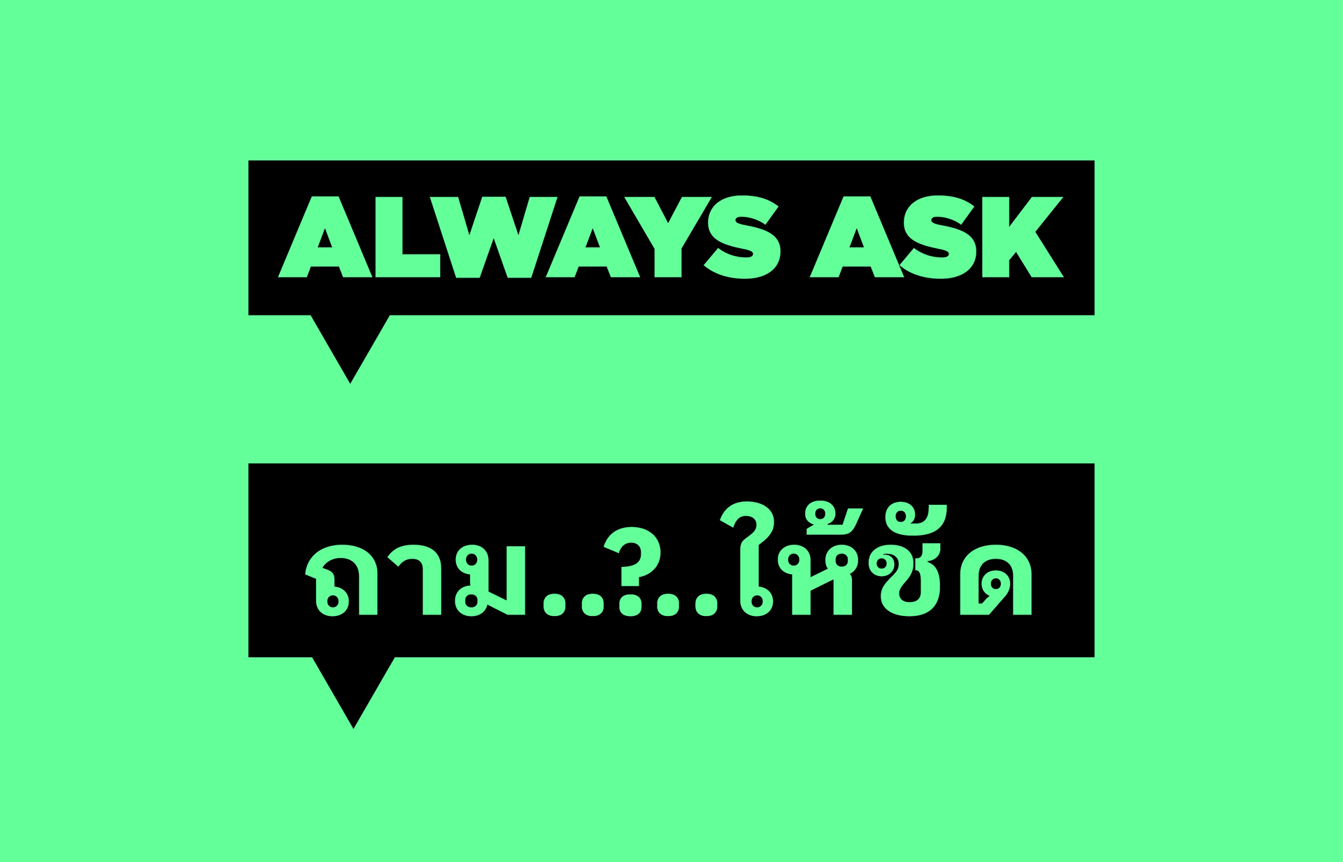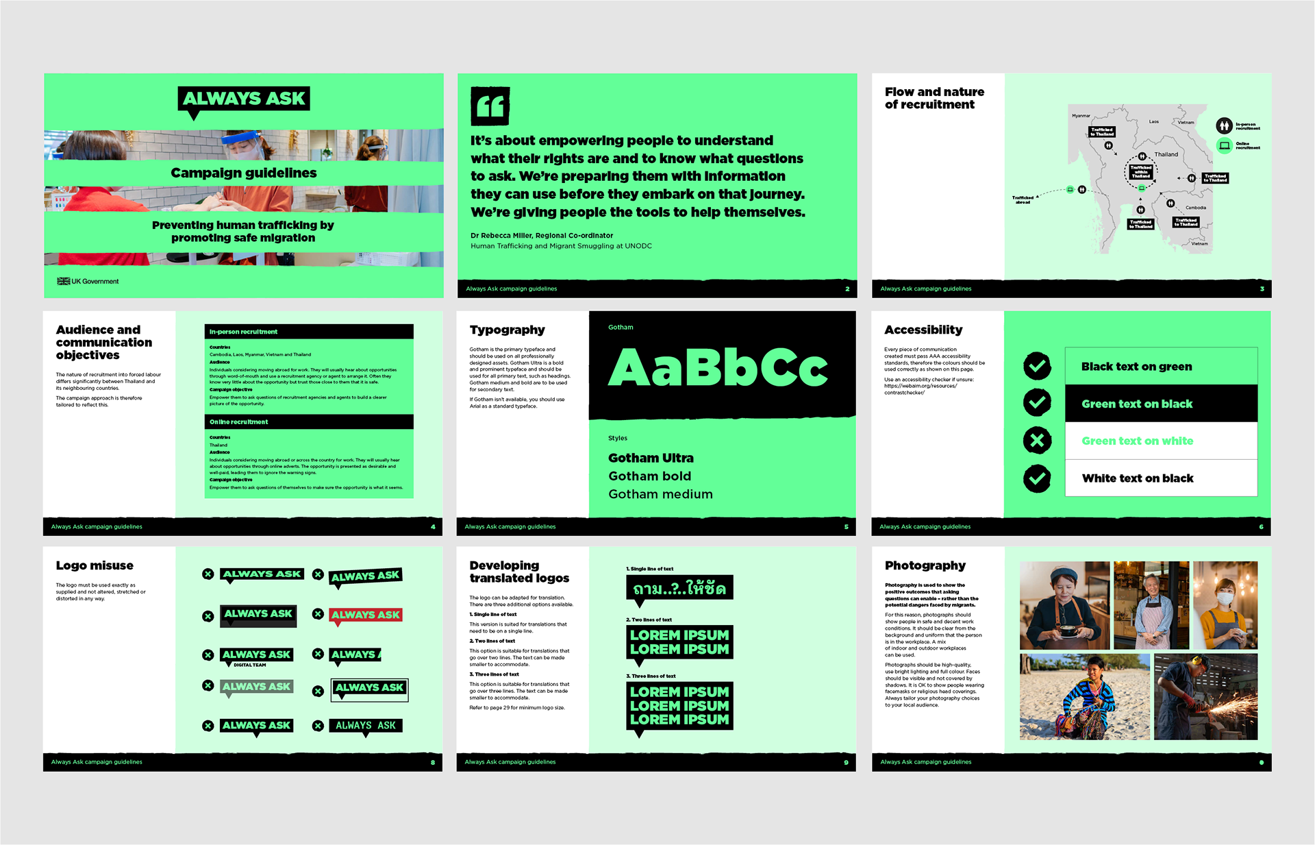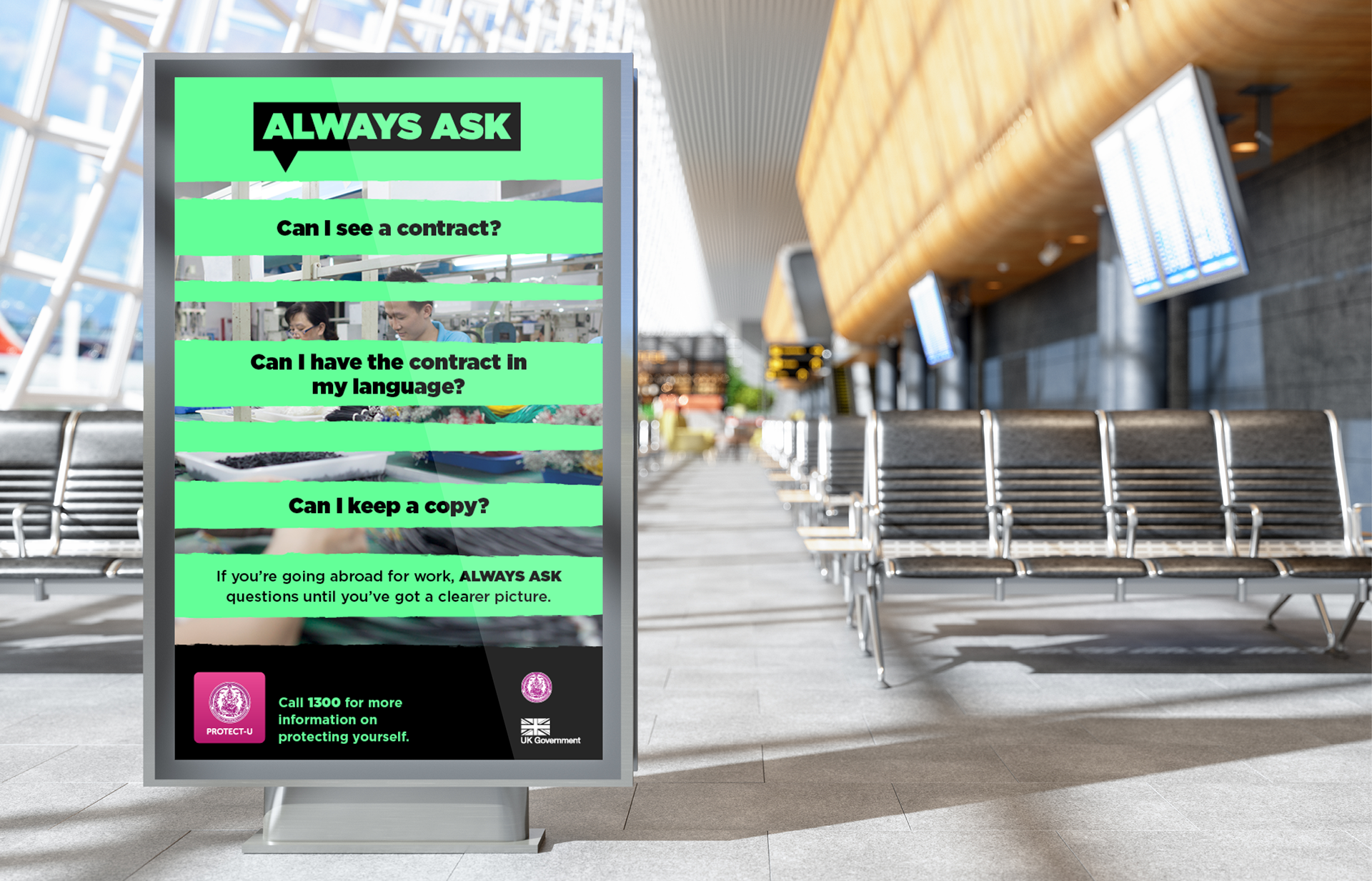 To prompt migrants to ‘always ask’ themselves and potential employers important questions, partially-obscured photography has been used to show how migrants may not always be getting the full picture. Positive imagery and the predominant use of bright green create a sense of empowerment, rather than danger.